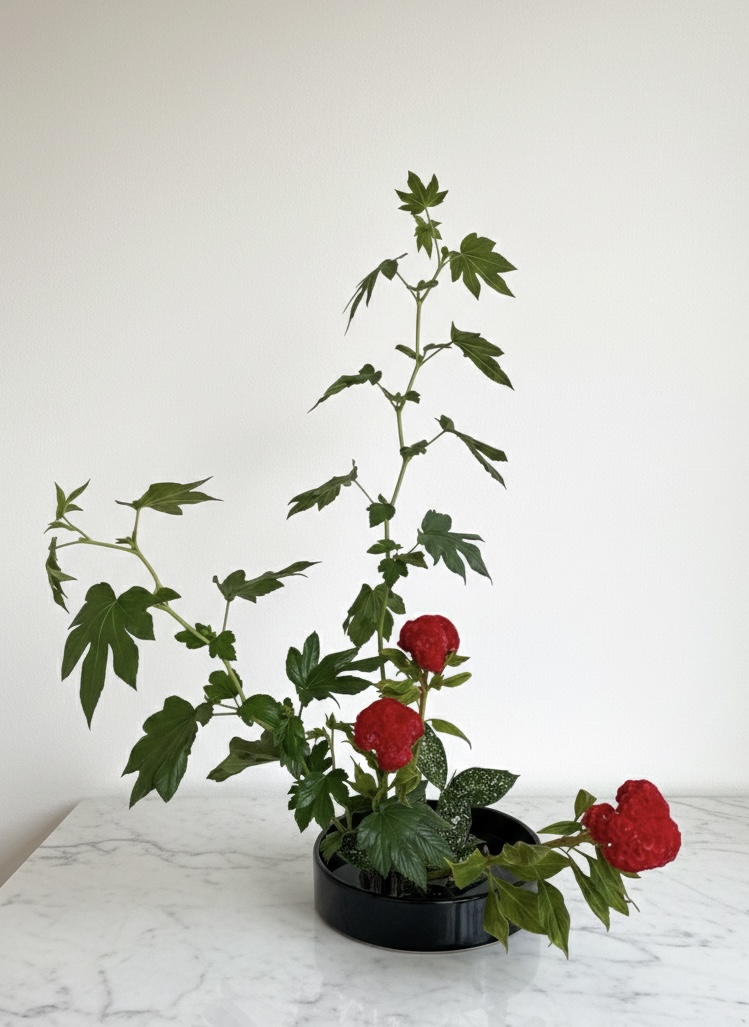 鮮やかな真っ赤のケイトウが主役となり、空間に力強い存在感を放つ作品に。