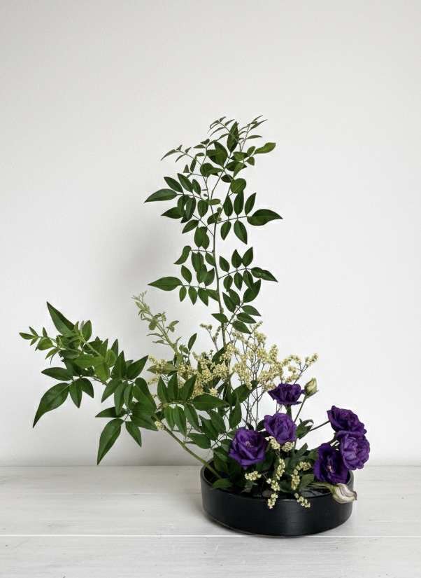 トルコキキョウの深みのある色合いとスターチスの軽やかさが、作品全体に凛とした表情を与えてくれました。