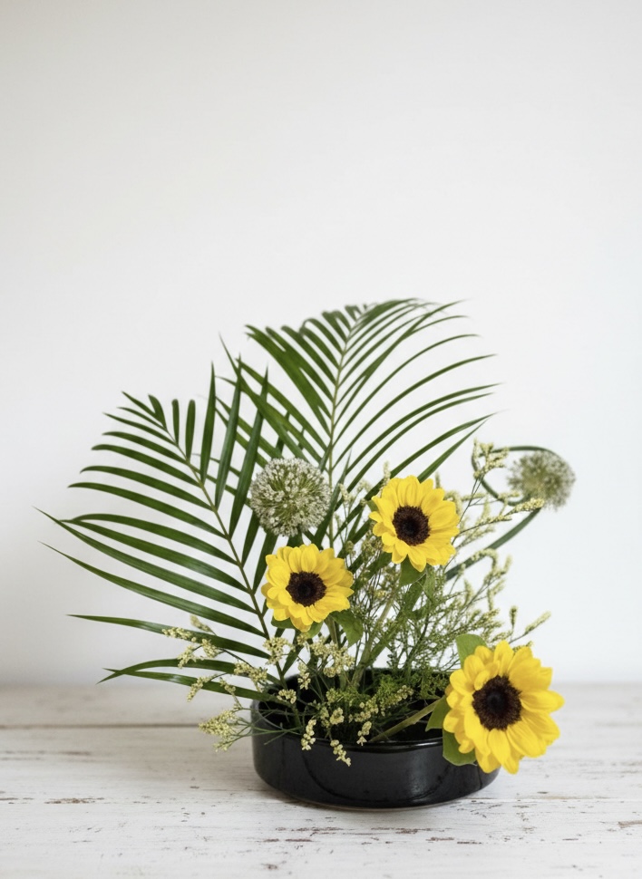 明るく伸びやかな向日葵を主役に、アレカヤシの軽やかな葉の動き、ソリダコの繊細な花、アリウムの個性的なフォルムを合わせた、夏らしいエネルギーに満ちた一作。