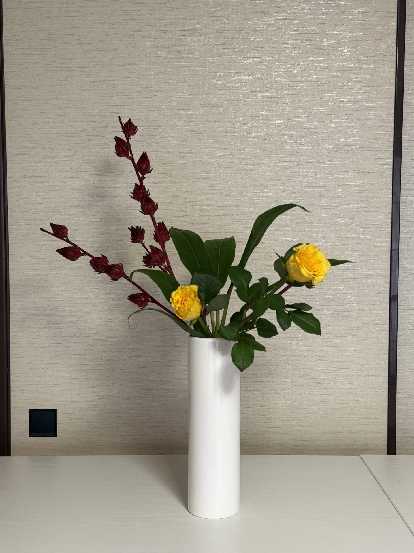 花材 バラ、ハイビスカスローゼル、ドラセナ