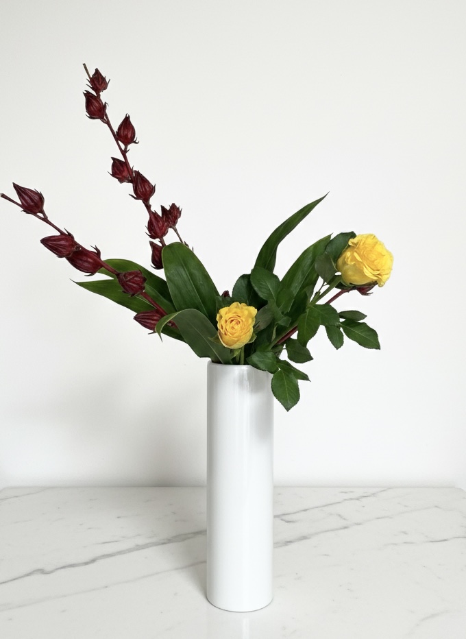 鮮やかな黄色のバラに、ハイビスカスローゼルの深みのある赤、そしてドラセナの落ち着いたグリーン。