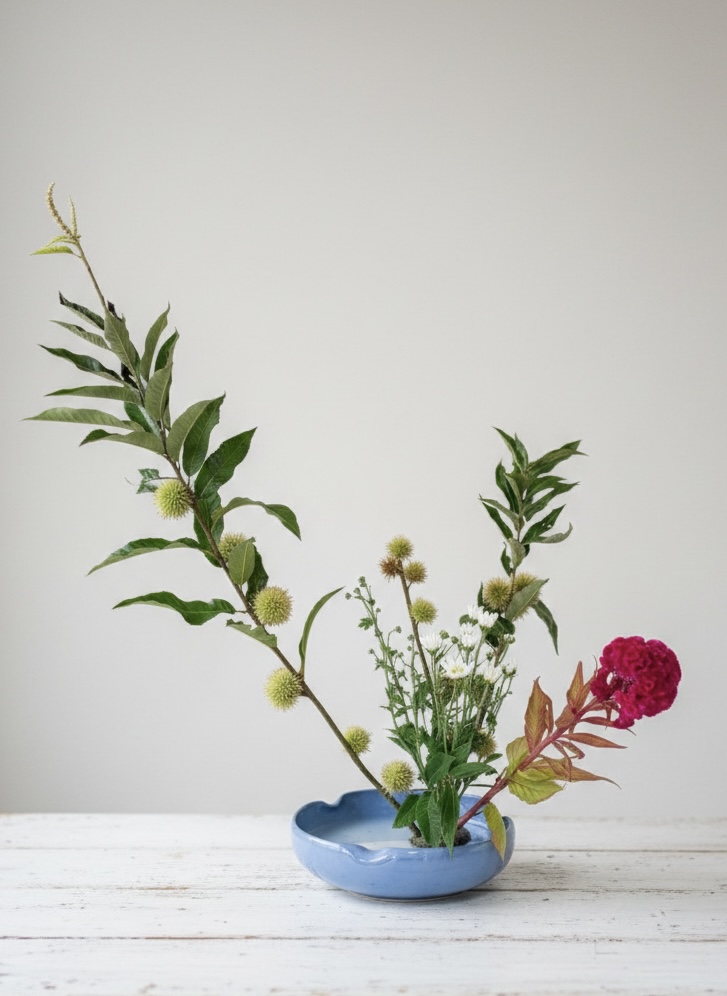 鮮やかなケイトウの色彩と、栗の若々しい緑とのコントラストが印象的で、目に映るだけで元気をもらえるような組み合わせに。