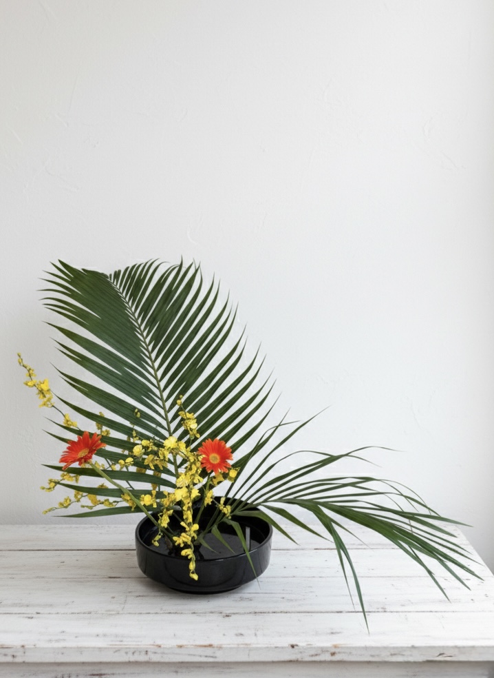 アレカヤシの軽やかな葉の動きに、オレンジュームとガーベラの明るい色合いが加わり、心も弾むような作品になりました。