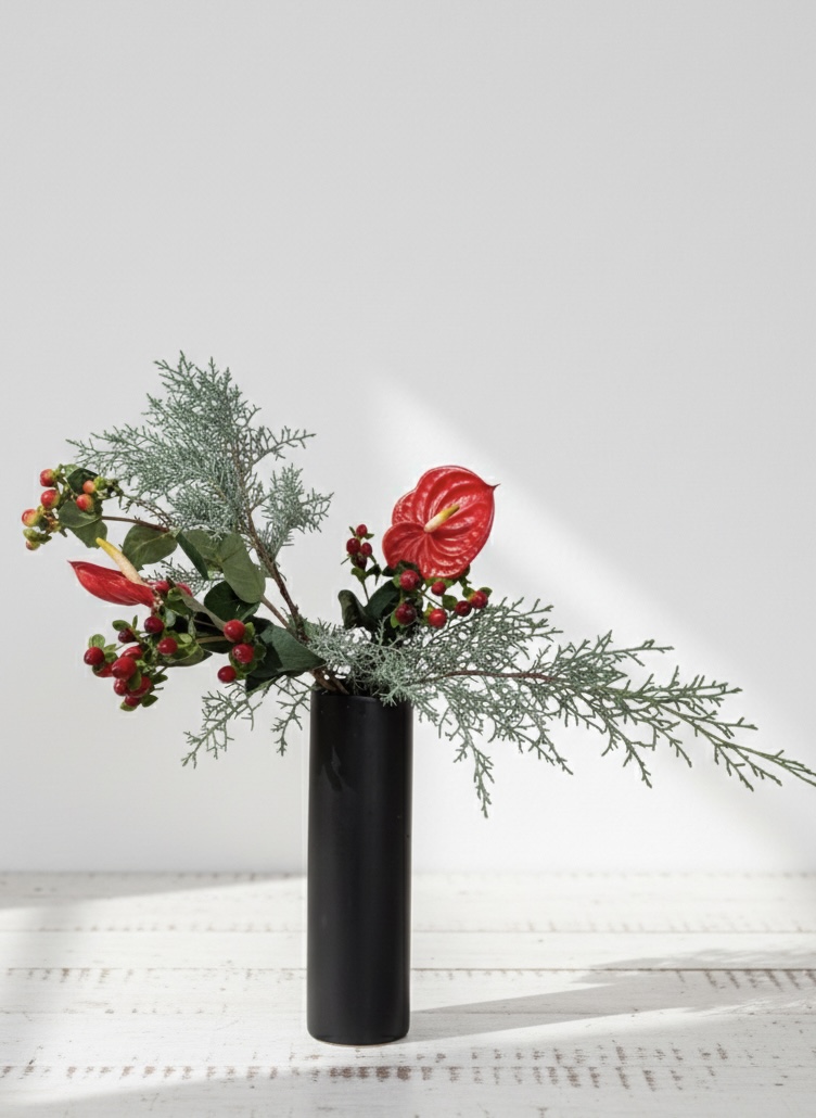 花材 コニファー(ブルーアイス)、ヒペリカム(二種)、アンスリウム
