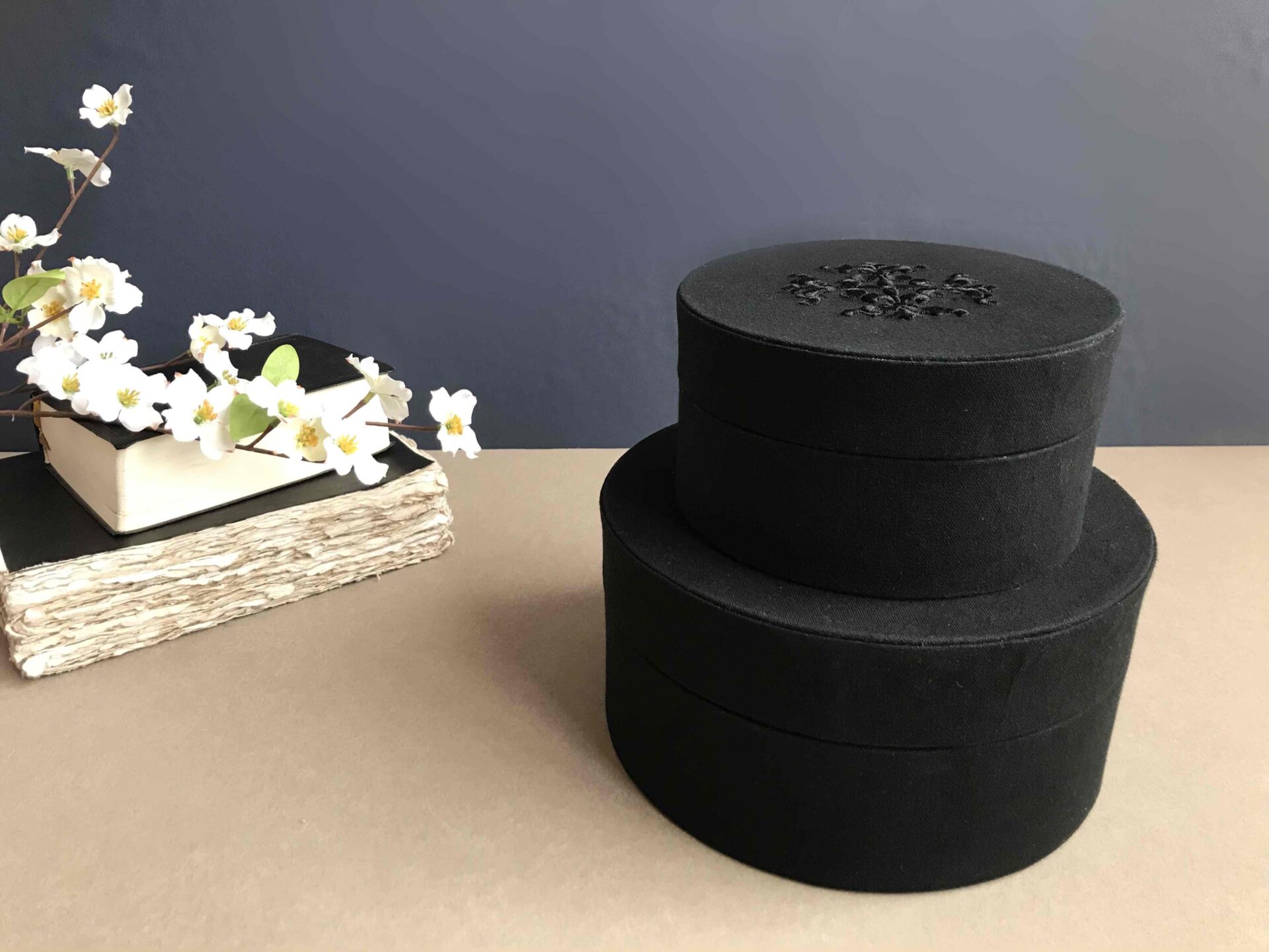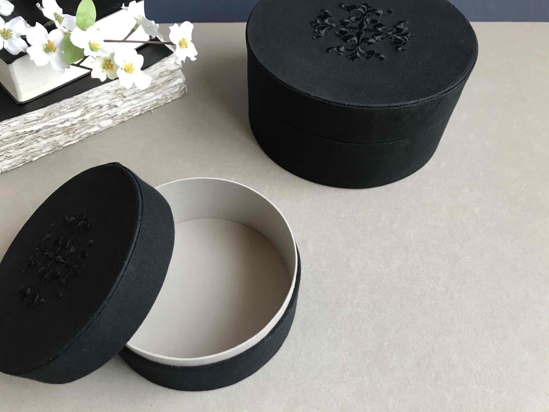 厚紙と布で作るカルトナージュの技法を使った丸箱の作り方レシピです。