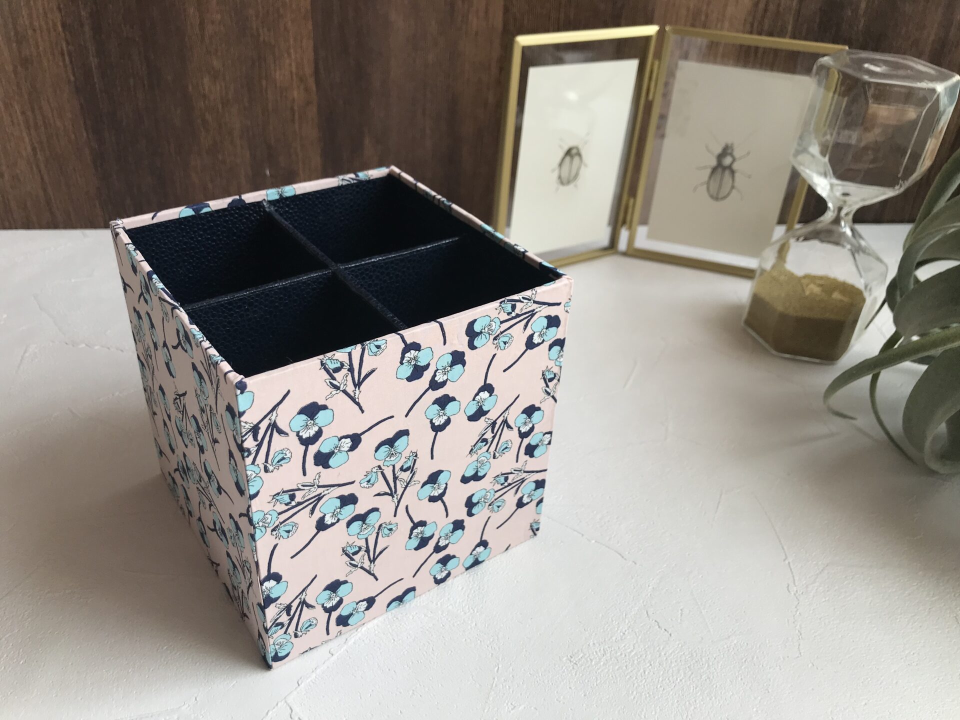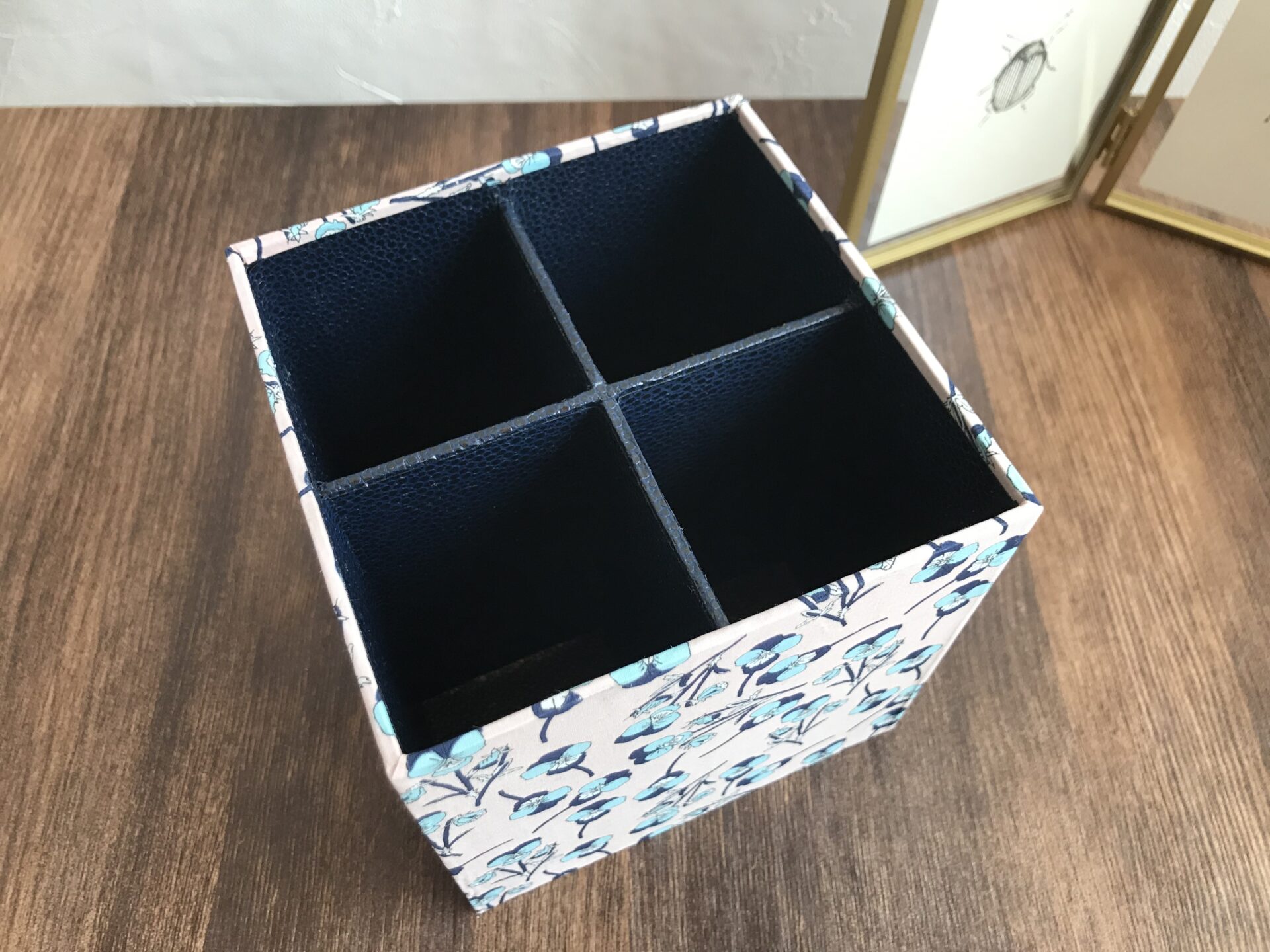 厚紙と布で作るカルトナージュの技法を使った仕切り箱・四分割の作り方レシピです。