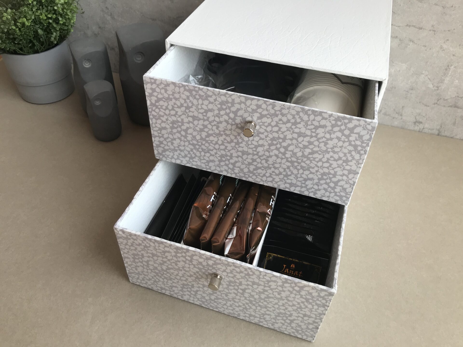 厚紙と布で作るカルトナージュの技法を使った小引き出しの作り方レシピです。